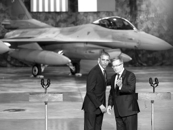 | 6月3日,美国总统奥巴马抵达华沙,开始对波兰进行访问。图为奥巴马与波兰总统科莫罗夫斯基向美军、波军士兵发表讲话后私下交流。 CFP供图 |