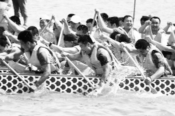 端午节,吃粽子,看龙舟,6月3日,2014聊城第三届“水文化”节暨第四届全民健身运动会龙舟比赛在东昌湖6号水域(凤广场北水域)举行。图为比赛中奋力划桨的参赛选手。 本报记者 李军 摄