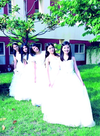 ◥曲阜师范大学美术学院的5名女生身着婚纱拍摄毕业写真。 本报通讯员 涂文鼎 摄