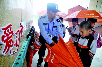 3日下午,为方便雨天没带伞的同学出行,威海市新都学校购入百余把爱心伞,由教师统一管理并在雨天分发给没有带伞上学的学生与家长使用。
