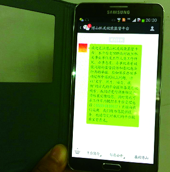 本报6月3日讯(记者 李超 通讯员 陈停 栾兆帅 孙国庆) 发现干部违规,群众可以微信举报。近日,博山纪委监察局开通“博山机关效能监督平台”公众微信号,发动群众举报干部违规。截至目前,微信平台已吸引356名“粉丝”,637次分享转发,收到群众咨询26条,投诉4条,处理投诉4件。 据了解,这是淄博市区县纪委建立的第一个微信监督平台,该平台承担发送机关作风效能有关资讯和政务服务信息,受理博山区党政机关事业单位及工作人员工作作风、办事态度、办事效率等问题和违纪违法行为的举报等功能。 “开通这个平台,主要是想强化执法执纪监察的力度,方便群众监督。”博山区纪委工作人员告诉记者。目前,微信平台由纪委执法和效能监督室负责维护,管理员接到群众反映后,整理举报信息,然后分到相关分管科室或派驻点进行调查核实,得出处理结果,然后通过该平台在规定的工作日内将处理结果反馈给举报群众。 为让群众了解这个微信平台,博山区纪委监察局制作了宣传展板60个,分别安放于全区45家机关事业单位59个窗口服务单位的显眼处。