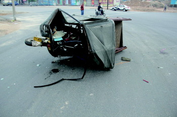 | 因为缺少防护,一旦发生交通事故,摩托车容易发生侧翻,骑车人极易受伤(资料片)。 |