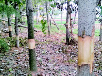 在滕州鲁班大道东十里岗村入口附近,紧靠村农田的绿化带树木遭了毒手。有的树木被扒了皮,一些树木甚至被拦腰砍断。荆河城管分局的工作人员介绍,经初步统计,约有51棵法桐树、56棵国槐树、85棵杨树被损害,目前民警已开始侦查。 本报见习记者 孙越 摄影报道