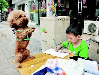 时间:2014年5月26日 自述:陪着小主人做功课,狗狗坐在桌子一角陪伴。 点评:“为了陪小主人,这样坐着卖萌容易嘛?”