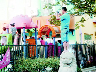 时间:2014年5月28日 自述:幼儿园文艺汇演,一个家长赤脚站在石狮子头上为孩子们拍照,把狮子踩得是“呲牙咧嘴”。 点评:即使为了留住成长瞬间,家长也不该踩着石雕秀功夫。