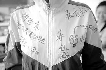 | 在教室里,阿迪力(左一)跟同学跳起维族舞蹈。 |  | 5日,青岛六十六中新疆班的考生们对高考充满信心。 |  | 艾力克木(中)、布尔玛(左二)和阿迪力(右二)。 |  | 一名新疆班考生穿着全班同学签名的校服,准备离校。 |