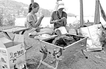 | 我们一家人在长清山区河边烧烤。娘俩负责穿肉串,本人主烤。