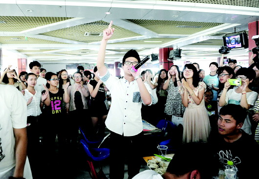 | ◥毕业生们在餐厅举行了“快闪”行动,现场气氛爆棚。 本报记者 周青先 摄 |