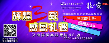 6月荷月,正值山东省最大英菲尼迪旗舰店三周年店庆,济南骐骥英菲尼迪将推出“感恩三载 钜惠齐鲁”主题活动,百万豪礼感恩回馈客户,订车即送价值万元的八重豪礼,6月14日店庆日厂家领导会亲临签售,全系价格保证全国最低,当天订车更可赠原厂英菲尼迪拉杆箱及3周年店庆精致生日蛋糕一份,店庆月所有前期及现场订车的客户均有机会获得奢华巴西游,亲身体验巴西足球的激情与火辣。 济南骐骥英菲尼迪三周年店庆,誓将精彩汽车生活进行到底,店庆月期间将携手齐鲁晚报、齐鲁晚报网、齐鲁晚报车友之家微信公众平台推出多项精彩活动回馈英菲尼迪车迷。 三周年店庆钜惠精彩第一波:关注济南骐骥英菲尼迪官方微博及微信或齐鲁晚报车友之家微信,参与“英菲尼迪车迷show出爱”活动,留下你的姓名+联系方式,领取英菲尼迪精美车贴,并贴于汽车后窗两周,即可获得200元油卡,100个名额等你来抢。 三周年店庆钜惠精彩第二波,英菲尼迪“敢·爱”快闪活力组合即将登陆济南万达广场、和谐广场、恒隆广场、泉城广场等济南地标性广场,上演英菲尼迪“敢·爱”青春活力秀。关注济南骐骥英菲尼迪或齐鲁晚报车友之家微信公众号,将快闪活力组合的照片,发送至朋友圈并截屏给济南骐骥英菲尼迪或齐鲁晚报车友之家微信公众号,即可有免费参与到英菲尼迪与齐鲁晚报车友之家联手打造的“免费观影”活动。 三周年店庆钜惠精彩第三波:英菲尼迪请全城车迷免费观影:6月8日-6月13日,凡在济南当地发送与英菲尼迪相关元素(户外或报纸广告、logo、汽车、车贴等元素)的合影照片发送至朋友圈,并将截屏发送给济南骐骥英菲尼迪公众微信账号或齐鲁晚报车友之家微信公众账号,即可参与活动,成功领取电影票。济南骐骥英菲尼迪联手齐鲁晚报车友之家将在鲁信影城(和谐店)请全体英菲尼迪车迷朋友免费观影看大片。 济南骐骥英菲尼迪作为山东省最大的英菲尼迪4S店,为消费者提供“致情致盛、完美体验”的客户服务,是英菲尼迪一直秉承的发展理念,在济南骐骥购车,享受4年/10万公里免费保养,还可享受到英菲尼迪多种个性化售后服务尊享服务和24小时道路救援等其他一系列增值服务。 即刻预订,享受精彩!济南骐骥英菲尼迪 0531-83156999 售后服务 0531-83153999