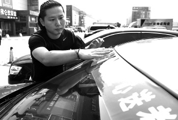 爱心车主程龙将爱心送考标识贴在挡风玻璃上。 本报记者 李岩松 摄