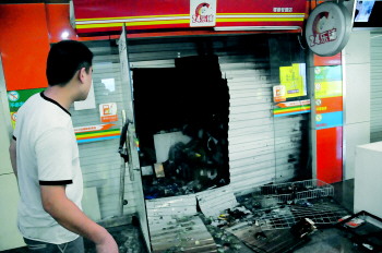 | 5日,沃尔玛地下通道一商铺着火,现场一片狼藉。 本报记者 李泊静 摄 |