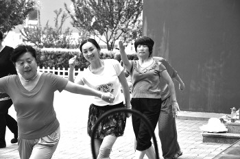 | 李敏穿着白色T恤在学跳广场舞。 本报记者 张永斌 摄 |