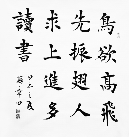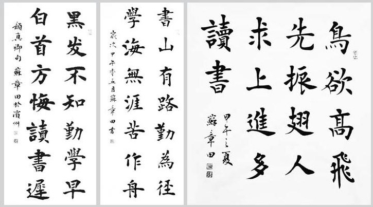 本报6月5日讯(记者 郗运红) 由市文明办、团市委、市少工委、齐鲁晚报·今日滨州联合举办的“古村朱家峪旅游”杯迎六一少年儿童“四德与国学”书画大赛已于5月25日评选完毕。为支持本报活动,更好地宣扬“四德与国学”,弘扬中国的传统文化,鼓励中小学生立志学习,著名书法家苏章田将无偿提供12幅书法作品,作为书画大赛的一等奖奖品。 苏章田,中国楹联学会会员、中国国际书画院院士、滨州市作协、书协会员福建盛世开元书画院高级艺术家,北京天地华艺国际文化公司、中国国际书画院、人民艺术家协会等签约书法家。2010年作品入展中日“孔孟文化”书画交流展,中欧艺术家原创精品展。他擅长真草隶篆(包括石鼓文、金文、甲骨文)各种字体的书写以及花鸟画、山水画、散文和诗歌、楹联创作,是位极具发展潜力的著名书法家。 苏章田书法作品作为此次书画大赛一等奖的奖品,他谦虚地说:“很高兴我的作品能够作为大赛的一等奖奖品,颁发给这些爱学习、爱艺术的孩子们,同时也感到受之有愧。我也是自幼喜爱书法,希望这些孩子们能像我一样坚持下去,把书法练好,将来肯定会比我更加优秀。” 他的书法作品有“鸟欲高飞先振翅,人求上进先读书”、“读书应是蜂酿蜜,好学恰如蝶恋花”、“书山有路勤为径,学海无涯苦作舟”等励志名句。苏章田说,书写的这些励志名句,都是一些很容易理解的、使人追求上进的句子,就是要告诉孩子们要多读书,才能进步,鼓励孩子们励志勤学。 苏章田说,书法是修身养性的一项中国的传统国学,必须要把传统的东西传承下去,这次比赛为鼓励孩子们走向艺术之路开了个好头。“书法的学习之路很漫长,孩子们刚刚开始学习,一定要注意正确的方式方法,不然就会走很多的弯路。刚开始临摹的时候一定要认真观察,临帖临名家名帖,多写多练,书法的理论知识、规律要善于总结,做好笔记。要把枯燥的学习当成一种乐趣,而不是负担,这样才能够走的长远,才能把书法真正的写好。” 苏章田提供给“四德与国学”书画大赛的一等奖作品。