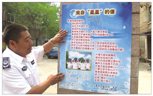 本报6月5日讯(记者 郭延冉) “大爷每天都打牌吗?为了孩子先别玩了。娱乐活动必不可少,为了孩子您先忍忍吧……”这封名为“来自星星的信”是莱芜市城管执法局鲁中矿中队在辖区10几个生活小区内贴出的,内容模仿耳熟能详的《一封家书》,语气亲切,信最后“星星中队”的落款也格外有爱。辖区内200多名考生马上就要参加高考了,执法人员通过这种方式,呼吁小区居民先暂停娱乐活动,为孩子们营造一个安静的复习备战氛围。 “这封信贴出来好几天了,这种家信的方式来提醒大家注意保持小区安静,居民也更容易接受,也让人感到特别温馨。效果很不错,大爷大妈们看到后都很自觉地取消或缩短了娱乐时间。”小区居民石女士家有备战中考的孩子,很了解考生家长和孩子的心,她觉得执法人员的做法很用心。“一看到‘来自星星’这几个字就很吸引人,采用家书的语气发出倡议的方式很新颖,让人看了心里也舒服。如果是白纸黑字的大通稿,大家根本不愿看。”鲁中矿工人于先生说。 其实,这种高考前发出的温馨体倡议在这个辖区已经不是第一次了。据鲁中矿行政执法中队队长景根东介绍,去年张贴的“淘宝体”通知取得了很好的效果,在居民中的口碑也不错。今年就结合最火的韩剧,写了一封“来自星星的信”,还拍摄了一个小短片,该片已经在鲁中矿电视台播放。短片的创意来自该社区管理服务部党群工作科科长许波,构思加拍摄仅用了一天时间。3分钟的小短片配着许波演唱的“来自星星的信”,片中,执法人员一会儿拿着道具牌提示高考时间,一会儿跟广场上跳舞、社区里下棋打麻将的大爷大妈们沟通,特别亲切,短片格调诙谐轻松。 “两年来,在高考前夕以或幽默、或温馨的书信倡议辖区居民为考生营造安静氛围,是我们执法人员转变执法方式的一种探索,也是社区管理服务部‘功德在心中,文明在行动’活动的一部分。有时候,百姓们更愿意配合这样的柔情执法,社区氛围更和谐。”景根东说。