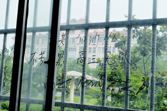 | 离校前,高三学生在教室玻璃上的留言。 本报记者 杨霄 摄 |
