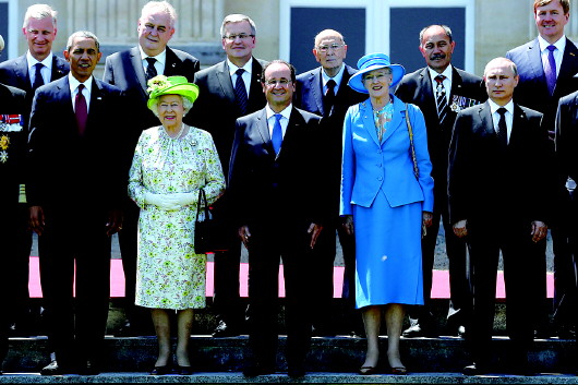 | ◥6日,在法国诺曼底地区乌伊斯特勒昂,乌克兰当选总统波罗申科(左)从俄罗斯总统普京(右)身旁走过。 新华/美联 |  | 6日,参加诺曼底登陆70周年纪念仪式的(前排左起)美国总统奥巴马、英国女王伊丽莎白二世、法国总统奥朗德、丹麦女王玛格丽特二世、俄罗斯总统普京等嘉宾合影。 新华/路透 |