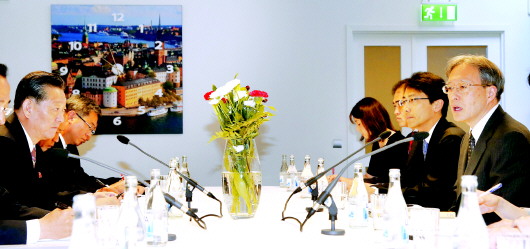 | 5月26日,日本外务省亚洲大洋洲局长(右一)伊原纯一和朝鲜的朝日邦交正常化谈判大使宋日昊,在瑞典斯德哥尔摩出席两国的局长级正式磋商。 东方IC供图 |