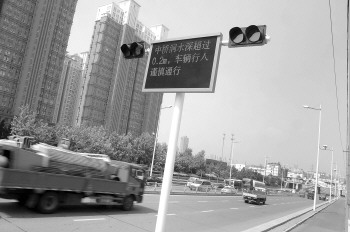 | 市区立交桥下安装积水警示系统,提醒过往车辆注意。 本报记者 李泊静 摄 |