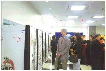 “翰墨中华·中国书画名家作品展”走进联合国总部 2014年5月27日,应联合国总部和中国常驻联合国代表团的邀请,由中国常驻联合国代表团、中国民族文化宫、山东省文学艺术界联合会、世界文化发展组织主办,中国国家民族画院、山东省美术家协会、西藏自治区美术家协会承办的“翰墨中华·中国书画名家作品联合国总部大展”在美国纽约联合国总部大厦隆重举办。这是山东书画家首次在联合国总部举办书画展。 联合国副秘书长、联合国文明联盟主席纳赛尔,中国常驻联合国代表团副代表、大使王民,中国民族文化宫主任宫兆强,中国书协理事、山东省文联党组书记、副主席于钦彦,全国政协常委、国家民族画院院长王林旭;中国美协理事、山东省美术家协会常务副主席朱全增,山东省美协主席团成员、理事孙成河、刘书军、何乃磊、徐永生、韩玮、杨文德和山东省书协副主席孟鸿声等10余位山东书画家,以及来自北京、天津、西藏的著名书画艺术家共计20余人参展。各国常驻联合国代表团使节、部分国家的艺术家及当地华人华侨艺术家100余人出席开幕式。纳赛尔主席、王民大使分别在开幕式上发表了热情洋溢地讲话,对展览给予高度评价。 这次展览共展出中国书画家作品60余幅。据策展人王林旭先生介绍,参展的中国书画家都是当代水平较高的书画名家,他们的作品主题鲜明,内涵丰富,技艺精湛,绚丽多姿,具有突出的艺术特色:一是体现出中国优秀传统文化的鲜明特质。中国书画艺术作为东方文化艺术的代表和典范,植根于并传承着中华民族优秀文化的精髓,承载着中国孔子仁义礼智信的伦理思想,反映着中华民族自强不息、厚德载物的民族精神,山东的艺术家创作的作品对此有着充分的诠释和体现;二是反映着艺术家关注生活、关注社会、关注自然、追求人类美好生存发展环境的理念。参展作品运用艺术元素形象地表达了热爱山川万象、呼吁保护生态环境、实现人类可持续发展的美好愿景。鲁籍画家王林旭先生创作的水墨超象艺术作品,关注自然,关注生态,主题突出,技艺精湛,大气磅礴,引起现场观众的强烈共鸣和一致好评;三是体现了继承、借鉴与创新的有机统一。参展的书画艺术作品既立足传统,秉承传统艺术血脉,又博采众长,汲取世界优秀艺术元素进行融合创新,既原汁原味地展现中国书画的传统技法,又淋漓尽致地表现了当代艺术创作风格,具有鲜明的民族特色和较高的艺术审美价值,充分体现了中国书画艺术的独特魅力。 “越是民族的,越是世界的。”这次中国书画艺术家赴联合国总部举办的展览,加强了中国艺术家与世界各国艺术家思想和文化的交流。展览经有关媒体进行了广泛报道,在纽约引起较大反响,观看展览的国际友人及社会各界人士络绎不绝。纳赛尔主席称赞这些中国艺术家的作品风格独特,文化底蕴深厚,是世界文化之林里重要的组成部分之一。王民大使看了展览后高兴地说,这次中国书画作品展是我看到的一次文化艺术交流热潮,希望国内的艺术家经常来开展艺术交流活动,为中华文化走向世界加油助力,为中华民族实现伟大的中国梦做出更大的贡献。 开幕式期间,于钦彦和朱全增分别向联合国总部捐献了个人精心创作的书画作品,受到联合国官员的高度赞扬。