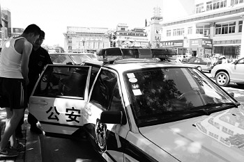 | 考生小张走上警车。本报记者 岳茵茵 摄 |