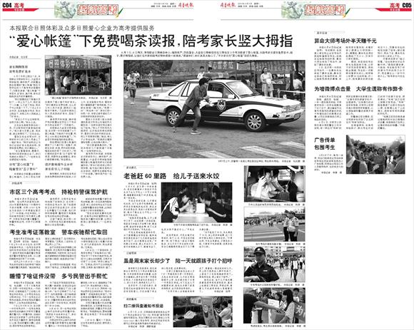 “爱心帐篷”下免费喝茶读报,陪考家长竖大拇指
