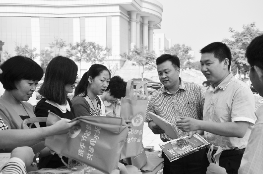 6月10日是“全国低碳日”,滨州市启动节能宣传周活动。当天,滨州市公共机构开展能源紧缺体验和绿色低碳出行活动。图为市机关事务管理局工作人员向市政大楼职工发放环保方便袋。 本报通讯员 綦宁 本报记者 王晓霜 摄影报道