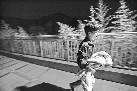| 11日晚间,一名男子怀抱婴儿匆匆走向安全岛。 本报记者 戴伟 摄 |