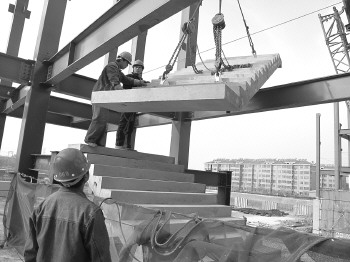 | 试点项目施工现场,工人正在安装预制楼梯。整个试点项目万余平米的建筑体量,都是由这样的预制部件拼接而成。 |
