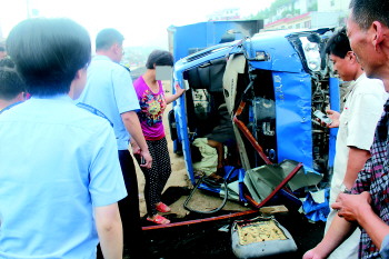 本报96706热线消息(记者 尉伟) 6月11日上午,省城二环东路与浆水泉西路交会口附近,一辆拉沙货车在下坡时突然失控,撞上路中挡板后侧翻工地内。发现异常后,历下巡警三中队、历下协勤大队主动施以援手,并在120医生的指挥下,将受伤的被困司机救出。 6月11日上午10点半,历下公安巡警三中队民警郭梦秋巡逻至二环东路与浆水泉西路交会口附近时,突然遇到几名市民招手拦车。 “他们说前边出了车祸,有人被困。”得知此事后,郭梦秋立即驱车向前。果然,在北行车道附近,他发现一辆蓝色货车侧翻于工地内,车头变形扭曲。在驾驶员位置,一名中年男子表情痛苦,嘴唇发白。 “快救救我丈夫。”现场,一名中年女子抱着惊魂未定的儿子向民警求助。与此同时,发现异常的历下协勤大队的民警、协勤队员也赶来帮忙。 原来,这名中年女子姓张,被困男子是其丈夫邢师傅,他们来自长清。当天上午,邢师傅拉着一车沙子从段店出发路过此处,给一工地送料。 张女士回忆,她和丈夫坐在前排,六岁大的儿子在后排,“突然,我就听他说,怎么没刹车……”由于前方还有其他车辆,驾驶失控货车的邢师傅躲避时撞上了路中的挡板,冲进工地发生侧翻。所幸张女士和儿子并无大碍,很快爬出了侧翻的货车,而邢师傅却被困车内。 经120医生现场初步检查,邢师傅骨盆处多处骨折,脏器也有损伤。邢师傅随后被众人从变形的驾驶室内救出,并由120急救车送往武警医院救治。 在武警医院,记者见到了受伤的邢师傅。此时,躺在担架床上的他处于休克状态。据医生介绍,邢师傅部分脏器受损,有内出血,需要立即手术治疗。 目前,事故原因警方仍在调查中。