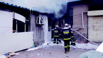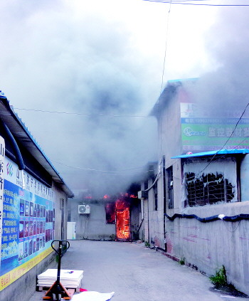 本报2110110消息(记者 路帅 见习记者 苏洪印) 11日8时许,济宁城区一处仓库区域燃起大火,多间仓库被引燃。消防部门很快将明火扑灭,但由于仓库内存放的数码产品较多,浓烟持续了一个多小时才消散。目前消防部门正在调查起火原因,火灾未造成人员伤亡。 11日上午7时50分,记者赶到事发地点,路口西南侧冒起一股浓烟,现场弥漫着一股塑料烧焦的味道。记者到场时,一辆消防车正试图进入院内灭火,但被院内停放的各种车辆挡住了通道。记者看到,着火仓库位于后院西南角,简易的板房门窗处不停喷吐着火苗,火势十分凶猛,并伴随着浓重的黑烟。 随后,三辆消防车相继开进院内,消防队员连接好水带,一名消防队员手持水枪,站在距离起火板房前不足2米的地方,对准板房门窗喷射泡沫。8时17分,明火被扑灭,但由于该区域的仓库都是泡沫板房,而且相互连接,里面存放的又大都是数码产品,所以明火扑灭后,黑烟愈发浓重,从仓库顶部不断冒出。站在门口的三名消防队员被浓烟笼罩,被刺鼻的烟雾呛得流出了眼泪。 8时41分,着火仓库的管理员赶到现场,给消防队员画出了仓库内部结构图。随后,消防队员佩戴空气呼吸器进入仍在冒烟的仓库喷水灭火。由于仓库里面杂乱无章,现场浓烟几次腾起。直至9时07分,火势才被完全扑灭。 “先是旁边的帽厂着火,没多久就把隔壁的仓库引燃了,泡沫板房加上里面那些数码产品,火和烟都很大。”现场目击者邵先生告诉记者。“仓库里有我30多万的货,我们店的存货都在里面。”附近一商铺经营者任女士看着被烧毁的仓库,十分心疼。 目前,消防部门正在对起火原因进行调查,此次火灾未造成人员伤亡。