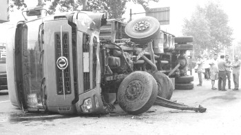 11日早上7点多,204国道回里附近,由于司机打了个瞌睡,一货车撞到路中隔离带侧翻,货车前轮由于碰撞发生变形,货车底部有明显划痕。“货车救援挺有难度,叫来两辆吊车先把货车立起来,货车底部受损也会影响拖车。”现场救援的工作人员说。据了解,事故车辆是从莱阳到烟台的物流货车,由于司机打了个瞌睡撞上路中隔离带侧翻,车上有3名人员,一人受轻伤。上午10点半左右,事故车辆被扶正拖走。 本报记者 蒋大伟 摄影报道