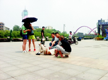 本报6月11日讯(记者 赵松刚)11日下午1点5分左右,一名青年男子在V1购物广场尾随两名女子实施盗窃,被迎面的40岁潍坊市民宋桂源发现后,立即冲上前去一个人将男子制服在地。记者在现场目击“勇敢大叔”制服小贼整个过程,大叔将小贼交给民警后,默然离去,目击市民称这是一位“勇敢大叔”。 11日下午1点5分左右,在V1购物广场上,两名女子从胜利街的台阶上由南向北走到广场上,一名身穿黄色上衣带花纹的青年男子跟随在两名女子的后面。刚从外地出差回来的40岁市民宋桂源则从北向南走,“当时我看到对面的两个女孩子后面跟着一个男子,这个男的偷偷摸摸地猫在她们后面。”宋桂源说,他当时就感觉不太对劲。 当两名女孩和后面的男子与宋桂源的距离约五六米时,男子的手伸向其中一个女孩的背包,拿出了一部手机。这时,早已经盯住男子的宋桂源迅速冲上去,以迅雷不及掩耳之势将男子摁倒在地,一只手抓住男子的手臂,另外一只手将男子摁倒在地上。男子反抗几次都没有成功,最终只能乖乖躺在地上。 两名女孩则被这一幕吓得惊魂甫定,紧紧靠在一起。宋桂源让两名女孩打电话报警,可是女孩却不敢打。随后,两名路过的男子走上前,帮助宋桂源制住被抓的小贼,宋桂源用自己的手机拨了110。大约5分钟后,附近派出所的民警赶到,用小贼身上的皮带将其手臂捆住,带上了警车。 两名女孩对宋桂源的义举表示感谢。当看着民警将小贼带上警车以后,宋桂源则沿着胜利街向东默然离开。正在现场的记者目睹了宋桂源擒住小贼的全过程,追上去仔细询问,才知道宋桂源的名字,并得知一些他的情况。 原来,宋桂源是山东崇盛冶金氧枪有限公司的一名高级经济师,家住奎文区虞新街附近,今年40岁。因工作的原因,平时经常在外出差。在发现这名小贼时,他刚从外地回到潍坊,正打算绕过V1购物广场去世纪泰华附近吃饭。当他发现时,就毫不犹豫地冲上去将对方制服。