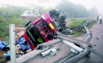 本报6月11日热线消息(记者 王琳)11日凌晨4时40分,一辆淄博籍解放半挂车沿青银高速公路由东向西行驶时,因操作不当驶入边沟发生侧翻事故。车上满载着的20多吨化工原料淌了一地,所幸这些原料没有燃烧和腐蚀危险,路政人员利用吊车和大型清障车将侧翻车辆施救完毕后,道路恢复通行。 据路政人员介绍,从事故现场情况看,事发时事故车辆车速较快,撞翻了路边大范围护栏并侧翻在边沟,其中一根W型护栏深深插入并嵌在了车头下部,所幸化工原料无燃烧、腐蚀、污染等危害,没有出现泄漏、散落现象,也没有人员受伤。早晨6点45分左右,路政人员扩大范围,吊车和大型清障设备进入,开始对侧翻车辆进行施救,救援人员首先用吊车将事故车吊出边沟,将车身扶正,随即大型清障车将车辆拖离现场。30多分钟后事故处理完毕,路政人员撤离现场,事故没有造成二次事故和交通堵塞。