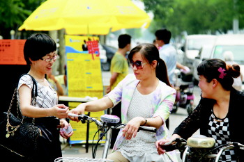 进入麦收高峰期后,许多打工族返乡,市区的招工市场变得冷清起来。10日,在三八路人力资源市场,有的招聘单位主动出击寻找求职者。 本报记者 王小会 摄