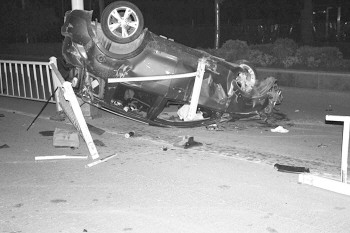 11日凌晨1时许,曹县一宾馆门前,一辆长安牌红色小轿车撞击到护栏后直接翻车,车头严重变形,路边防护栏被撞开。据当时目击者说,小轿车翻后,满身酒气肇事司机从车内爬出,头部还滴着血,他并没有报警,而是选择了偷偷逃跑。目前交警部门正在对此起交通事故进行调查。