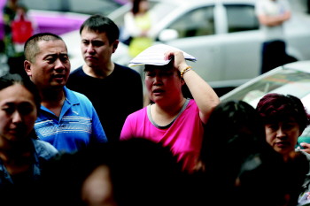 | 11日,青岛19中考点,一位家长顶着太阳陪考。