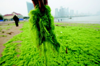 本报记者 张晓鹏 摄 |  | 竹岔岛近海海域出现长达两三公里的浒苔带。 本报记者 潘旭业 摄 |  | 11日下午,大量浒苔登陆三浴。 本报记者 张晓鹏 摄 |  | 11日晚7点,健身爱好者在被浒苔覆盖的三浴沙滩上跑步。