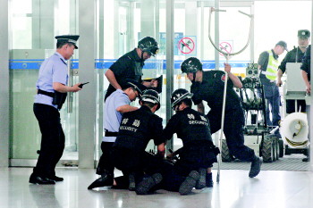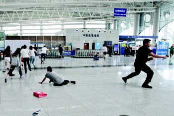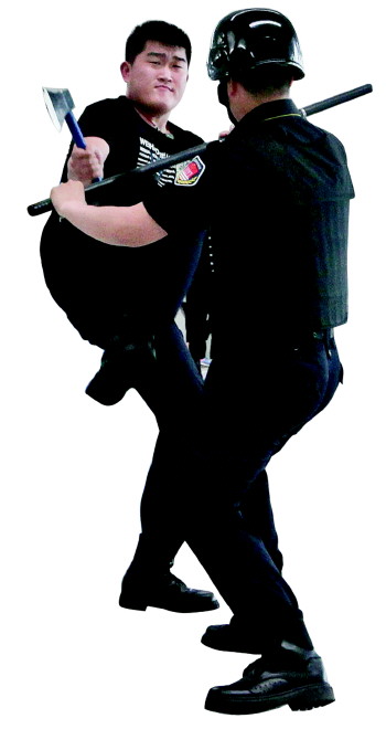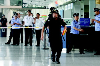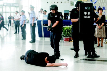 | 一名“歹徒”被民警当场击毙。 |  | “歹徒”持斧头砍伤一名旅客,其他旅客向安全区域逃生。 |  | 一名“歹徒”向机场出口逃窜,被多名民警制服。 |  | 机场医务人员对受伤旅客展开救护。 |  | |  | 发现疑似爆炸物后,民警迅速在该区域拉起警戒线。 |