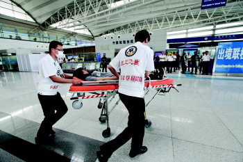 11日下午,三名持刀“歹徒”冲进流亭机场砍倒两名旅客,并扔下爆炸物逃离现场。特警、武警果断开枪,将一人击毙,并制服另外两人。这是当天青岛警方在流亭机场候机楼上演的一场反恐应急实战演练。 11日15时许,3名持砍刀和棍棒的男青年突然冲入大厅,挥刀砍杀正在办理乘机手续的旅客,有两名旅客瞬间被砍倒在地,其他旅客尖叫着四处逃生。机场保安人员发现后立即报警,并持长棍上前制止歹徒行凶。 此时,正在周边布防巡控的特警、武警、民警持枪械迅速赶到现场将“歹徒”包围。“立即放下凶器,不准动,否则后果自负。”持盾牌的特警对着行凶歹徒大喊,但疯狂的歹徒非但置之不理,反而持械冲向民警。见警告无效,特警、武警果断开枪,1名歹徒瞬间被击毙,两名歹徒被制服,但歹徒在逃跑时扔下一件可疑包裹。 接着,机场公安分局增援民警携带屏蔽仪、防爆箱、防爆毯及爆炸物探测仪迅速赶到现场,疏散旅客并设置警戒区域,特警排爆力量也随后赶到,遥控操作排爆机器人靠近可疑包裹进行测爆。发现有爆炸物成分后,民警迅速开展排爆工作,并将爆炸物移离现场。与此同时,机场医务人员迅速对受伤的旅客紧急救治,并用担架将重伤旅客抬上救护车,送往医院。 机场公安分局副局长陈军杰介绍,在当前复杂严峻的反恐维稳形势下,开展此次演练是为了检验各部门在发生暴恐袭击后的快速反应、协调联动等能力。当旅客遇到暴恐袭击时,应尽量保持镇定,听从民警指挥有秩序地疏散,若不能立即离开现场,应躲在民警或者柜台、指示牌等物体的背后躲避袭击。 文/本报记者 刘腾腾 本报通讯员 刘人斐 毕成 片/本报记者 杨广帅