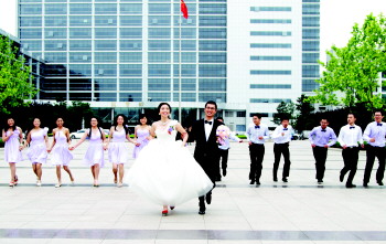 10日,一对硕士应届毕业生在中国石油大学(华东)的校园内举办婚礼。结束了7年的同窗生涯,新娘宋丙慧和新郎张星双双签约塔里木油田,毕业前准备了一场浪漫的校园婚礼。当天,新郎在宿舍内迎娶新娘,同学们则争做伴娘伴郎,一同见证这对研究生情侣的爱情事业双丰收。 本报记者 李珍梅 本报通讯员 王大勇 摄影报道