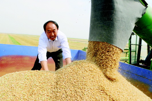 11日,位于无棣县柳堡镇的“渤海粮仓”项目示范区,十余台大型联合收割机正在紧张作业。据渤海粮仓无棣项目示范区负责人梁国栋介绍,今年的小麦长势不错,预计平均亩产可超过350公斤,预计3天可以收割完成。