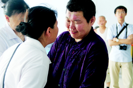 | 见到家人后,孔凡莉(右)笑了起来。 本报记者 王茜茜 摄 |