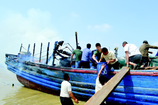 11日上午11时许,滨州公安边防支队海防边防派出所在巡逻中发现海防造船厂南侧一渔船船舱起火,迅速启动应急预案,组织5名官兵和附近渔船民一起参与救火行动。经过近2个小时的扑救,大火被扑灭,船体严重受损,船舱内有被褥、网具等均已被烧成灰烬,损失十余万元。该渔船为柴油动力的木质船舶,由于渔民做饭时用火不慎引发火灾。 本报通讯员 刘爱民 记者 刘涛 摄影报道