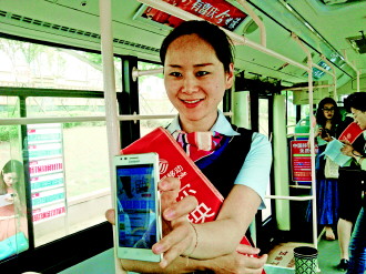 | ▲11日上午,K1线公交车上,移动通讯公司工作人员在向市民展示Wifi登录页面。 |