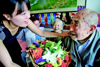 6月11日上午,天翔社区工作人员为95岁的阮树栋老人送去鲜花。社区工作人员还帮老人清理房间、清洗衣物。父亲节来临之时,天翔社区工作人员为社区10户老人送去节日祝福。