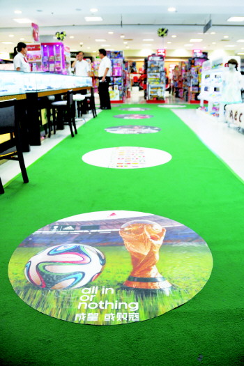 一家商场地面贴着世界杯海报。 本报记者 王鸿哲 摄