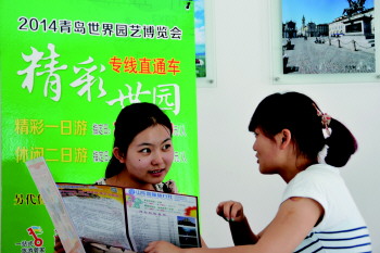 | 在张店人民西路一旅行社,工作人员向学生介绍一些旅游线路。