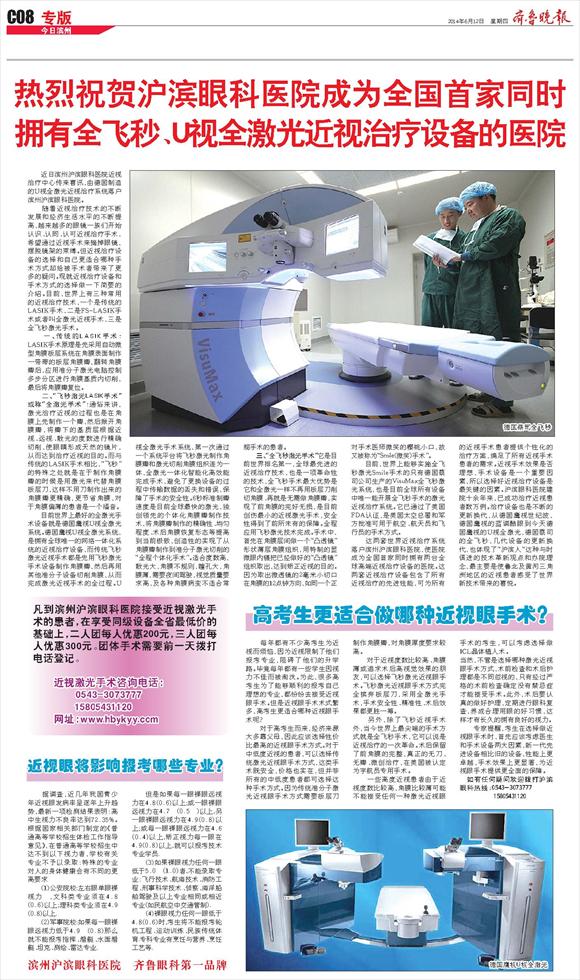 热烈祝贺沪滨眼科医院成为全国首家同时拥有全飞秒、U视全激光近视治疗设备的医院