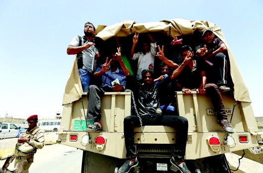 | 一些伊拉克人在巴格达征兵点参加伊拉克政府军后,乘坐卡车准备离开。 |  | 巴格达迪 |
