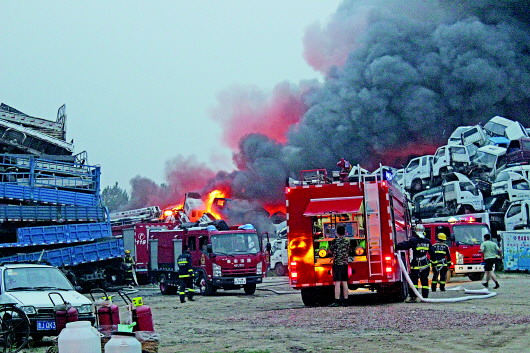 15日中午,记者再次到火灾现场看到,已有相关车辆在清理现场。一工人说,有近百辆报废车被烧毁,事故没造成人员伤亡。